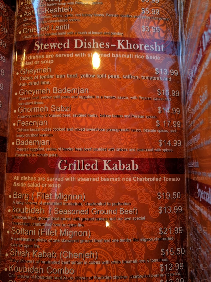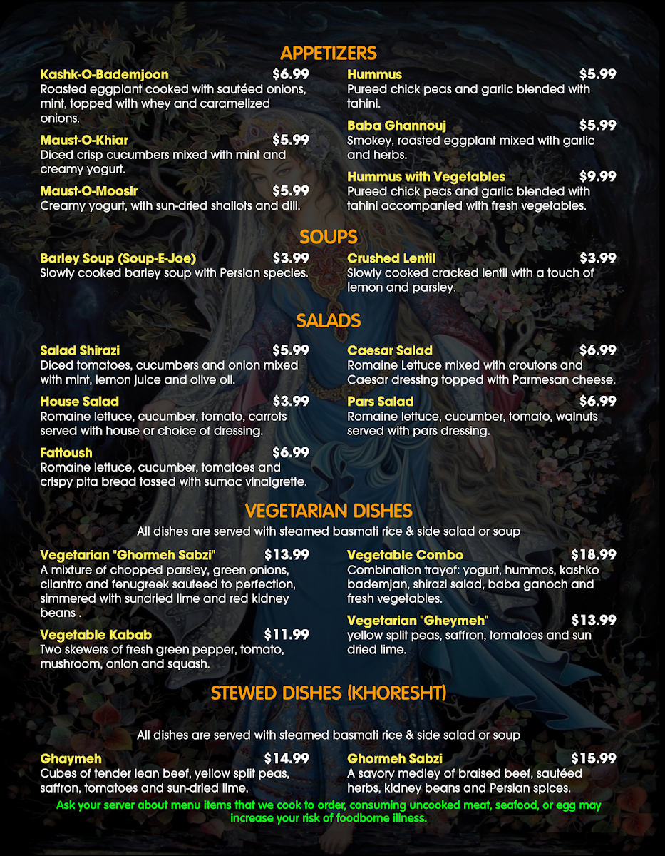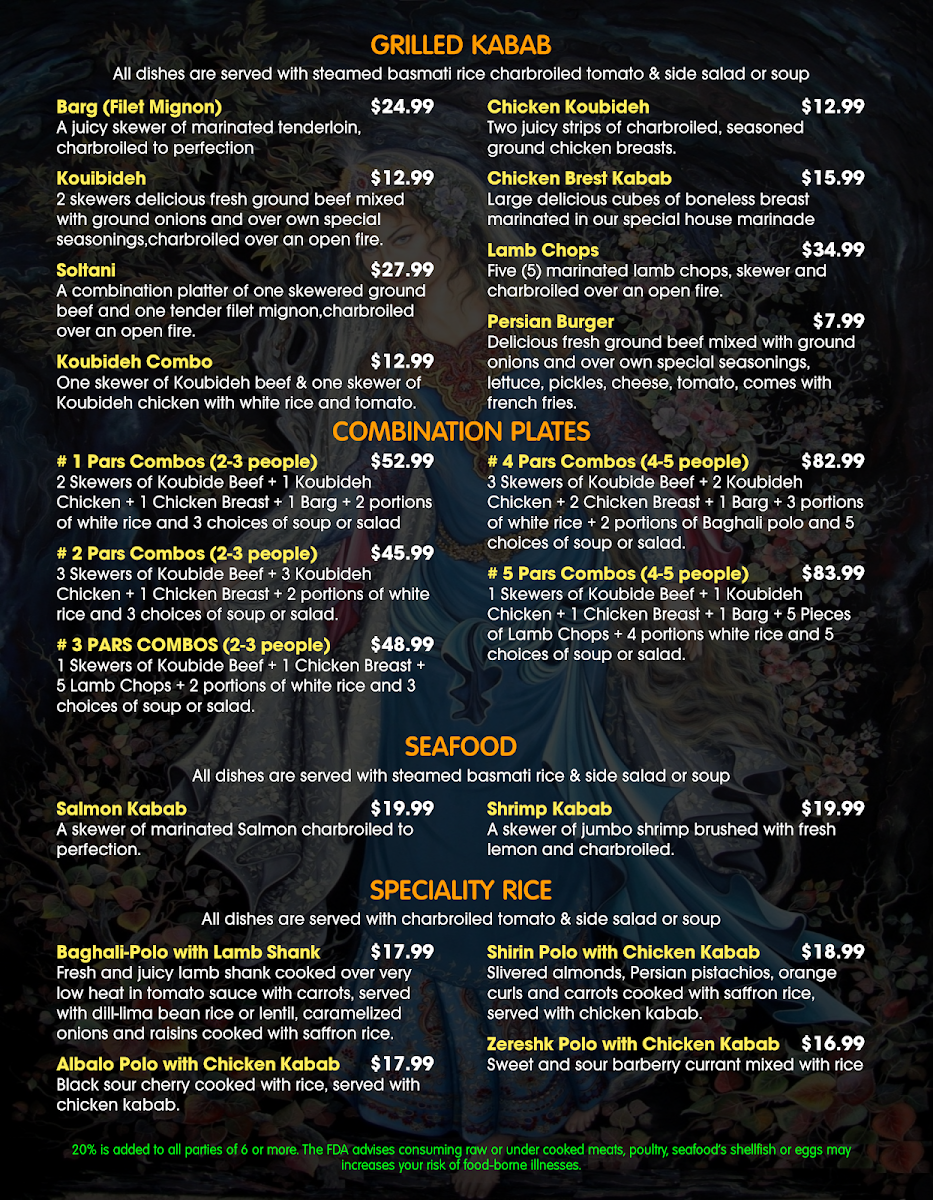 At Pars Restaurant, the menu is a celebration of bold flavors and rich traditions, offering a unique blend of Persian and Mediterranean cuisines. Whether you're in the mood for tender kebabs, savory stews, or freshly baked flatbreads, there's something for every palate. The Pars Restaurant Menu features a variety of appetizers, entrees, and desserts that will transport you to the heart of Persian culture with each bite. The dishes are prepared with the finest ingredients, bringing together vibrant spices and classic techniques to create an unforgettable dining experience. Each item on the menu is crafted with care and a commitment to authenticity, ensuring a deliciously satisfying meal for every guest. Whether you're visiting for a casual meal or a special celebration, Pars offers an inviting atmosphere and a menu that truly stands out in Farmington Hills.